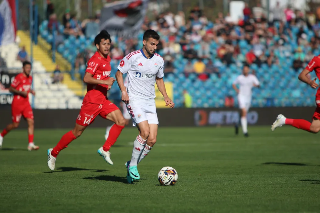 Frederic Ferreira Maciel și Mino Sota în meciul de fotbal dintre SC OȚELUL GALAȚI si AFC HERMANNSTADT SIBIU, contând pentru Superliga Superbet, desfășurat pe Stadionul Oțelul din Galați, sâmbătă 28 octombrie 2023. © FOTO: Valentin MUNTEANU/SPORT PICTURES
