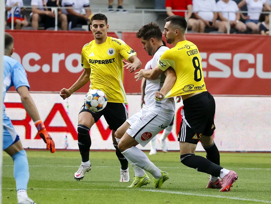Sergiu Florin Bus si Dorin Marian Codrea, Lucian Iulian Cristea in meciul de fotbal dintre AFC Hermannstadt Sibiu si FC Universitatea Cluj, contand pentru Superliga Superbet, desfasurat pe Stadionul Municipal din Sibiu, sambata 3 august 2025. © FOTO:Valentin Macrea/SPORT PICTURES
