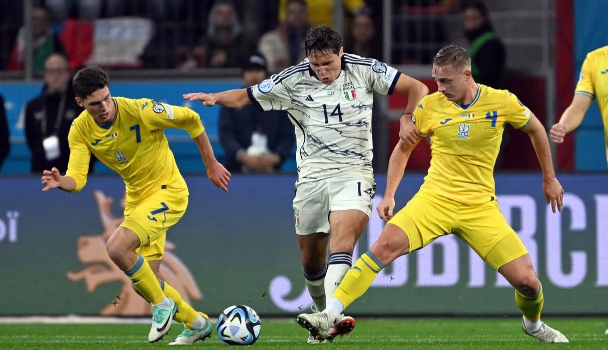 20 November 2023, North Rhine-Westphalia, Leverkusen: Soccer: European Championship qualifier, Ukraine - Italy, group stage, Group C, match day 10, in the BayArena. Ukraine's Oleksandr Svatok (r) and Italy's Federico Chiesa fight for the ball. Photo: Federico Gambarini/dpa,Image: 823306780, License: Rights-managed, Restrictions: GERMANY OUT, Model Release: no