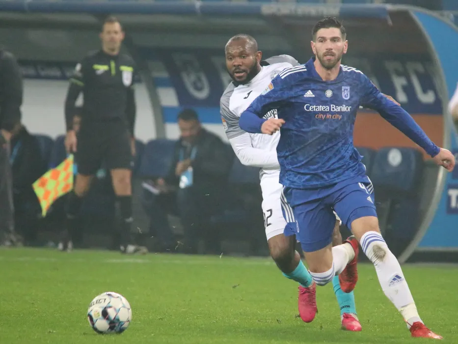 Dominik Kovacic si Michael Junior Omoh in meciul de fotbal dintre FC U Craiova 1948 si Academica Clinceni, contand pentru Liga 1 Casa Pariurilor, desfasurat pe Stadionul Ion Oblemenco din Craiova, vineri 10 decembrie 2021. © FOTO:Catalin Ciupureanu/SPORT PICTURES