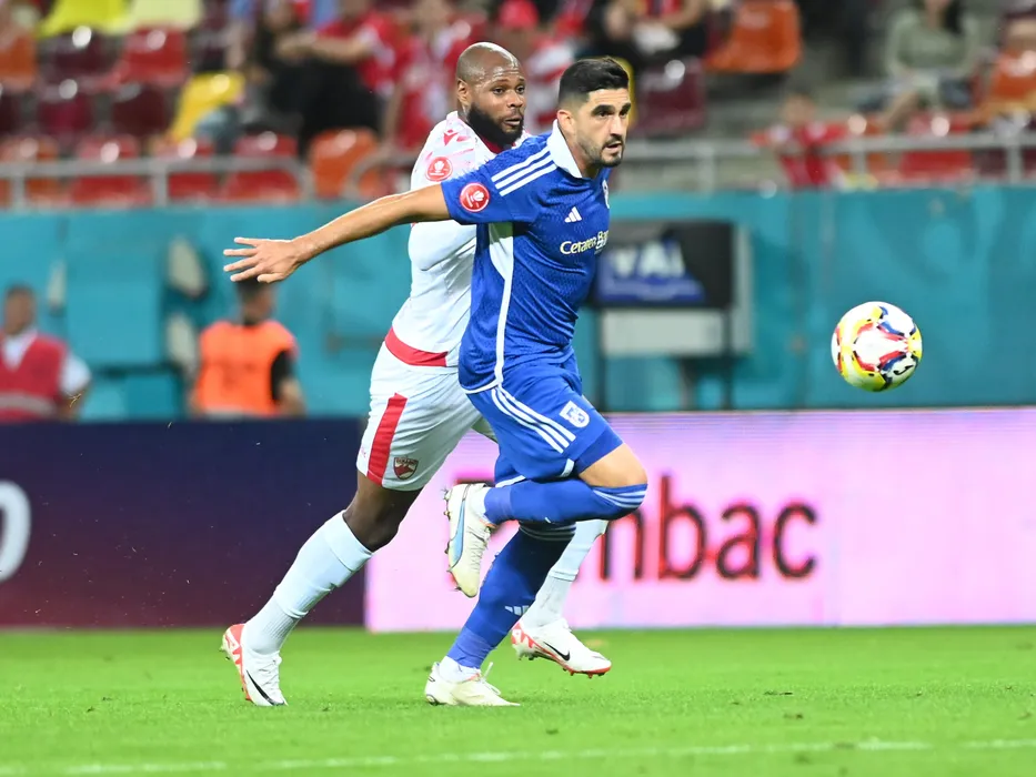 Hakim Djamel Abdallah si Henriques Danny Agostino in meciul de fotbal dintre Dinamo Bucuresti si FC U Craiova, din cadrul Cupei Romaniei Betano, desfasurat pe Arena Nationala din Bucuresti, marti 26 septembrie 2023. © FOTO:Razvan Pasarica/SPORT PICTURES