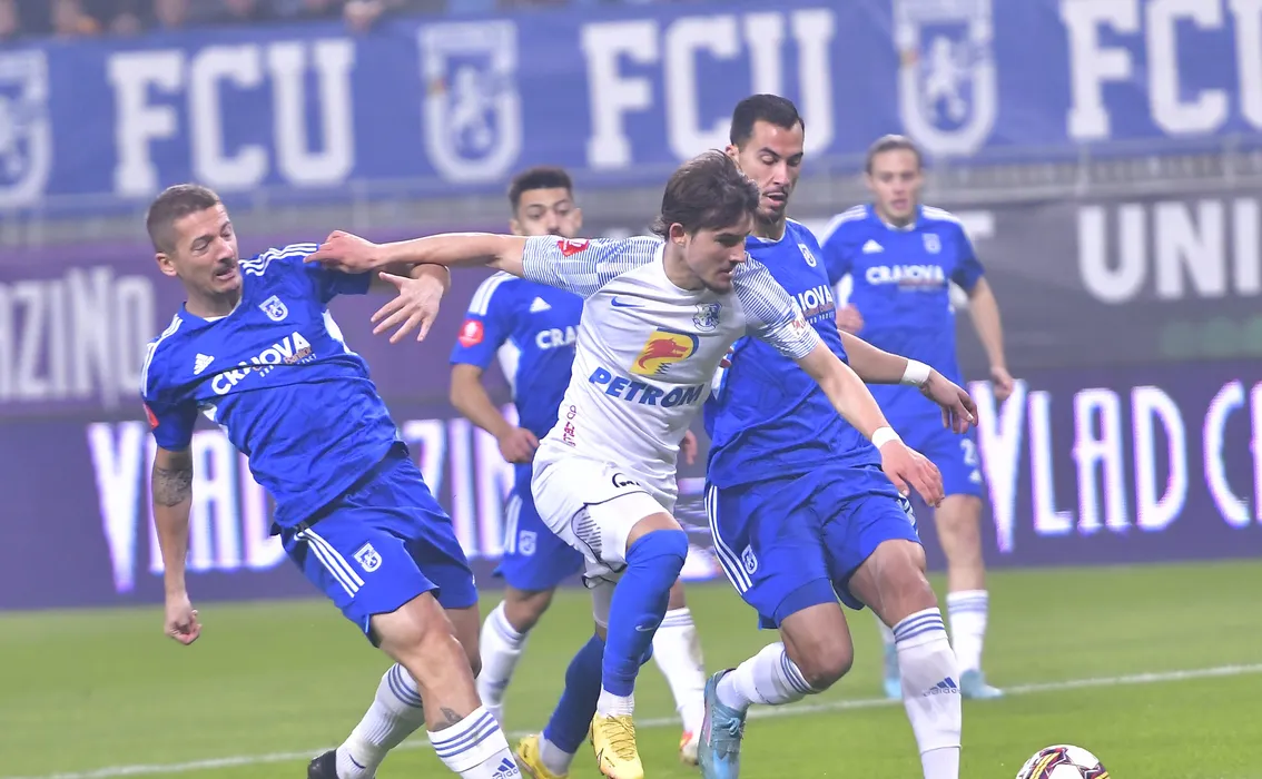 Alexandru Vlad Achim, Alexi Paul Pitu si Duarte Andre Lourenco in meciul de fotbal dintre FC U Craiova si Farul Constanta, contand pentru Superliga Superbet, desfasurat pe Stadionul Ion Oblemenco din Craiova, vineri 28 octombrie 2022. © FOTO:Razvan Pasarica/SPORT PICTURES
