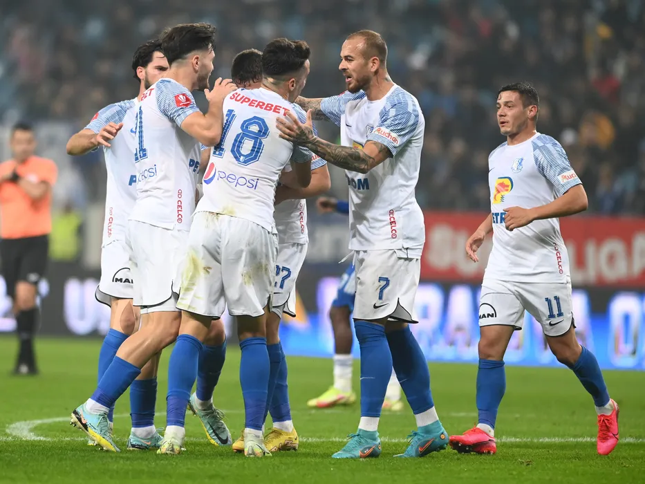 Sebastian Andrei Borza se bucura dupa un gol marcat alaturi de fotbalistii constanteni Andrei Viorel Artean, Denis Alibec si Gabriel Andrei Torje in meciul de fotbal dintre FC U Craiova si Farul Constanta, contand pentru Superliga Superbet, desfasurat pe Stadionul Ion Oblemenco din Craiova, vineri 28 octombrie 2022. © FOTO:Razvan Pasarica/SPORT PICTURES