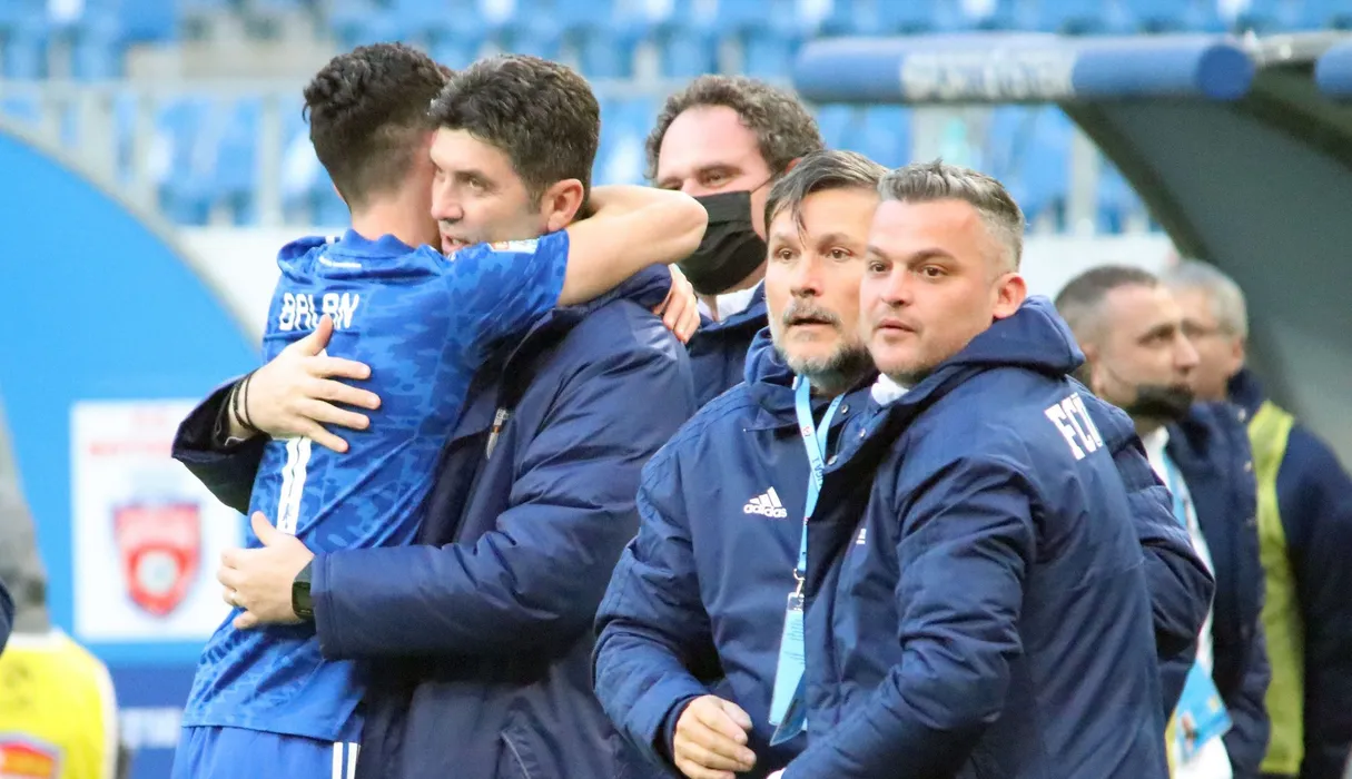 Fotbalistii craioveni se bucura dupa un gol marcat in meciul de fotbal dintre FC U Craiova 1948 si FC Botosani, contand pentru Liga 1 Casa Pariurilor, desfasurat pe Stadionul Ion Oblemenco din Craiova, joi 10 februarie 2022. © FOTO:Catalin Ciupureanu/SPORT PICTURES