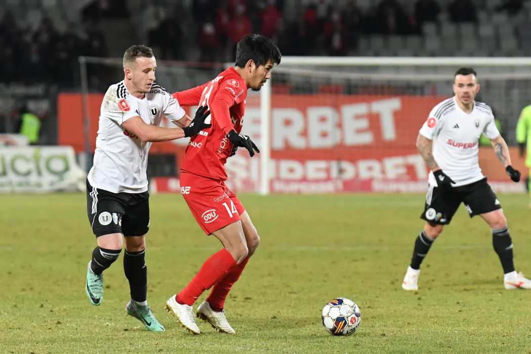 Mino Sota și Robert Mihai Silaghi în meciul de fotbal dintre FC Universitatea Cluj și AFC Hermannstadt contând pentru SUPERLIGA SUPERBET, desfășurat pe Stadionul CLUJ ARENA din Cluj-Napoca, sâmbătă 20 ianuarie 2024. © FOTO: Flaviu BUBOI/SPORT PICTURES