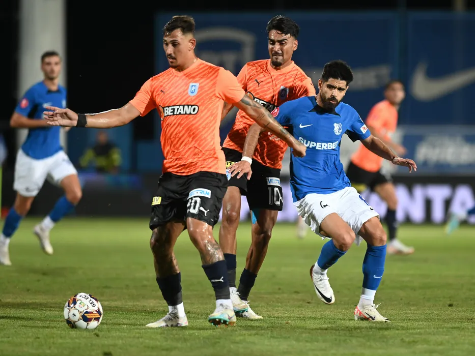 Jovan Markovic, Stefan Baiaram si Ionut Daniel Vina in meciul de fotbal dintre Farul Constanta si Universitatea Craiova, contand pentru Superliga Superbet, desfasurat pe Stadionul central al Academiei Gheorghe Hagi din Ovidiu, duminica 27 august 2023. © FOTO:Razvan Pasarica/SPORT PICTURES
