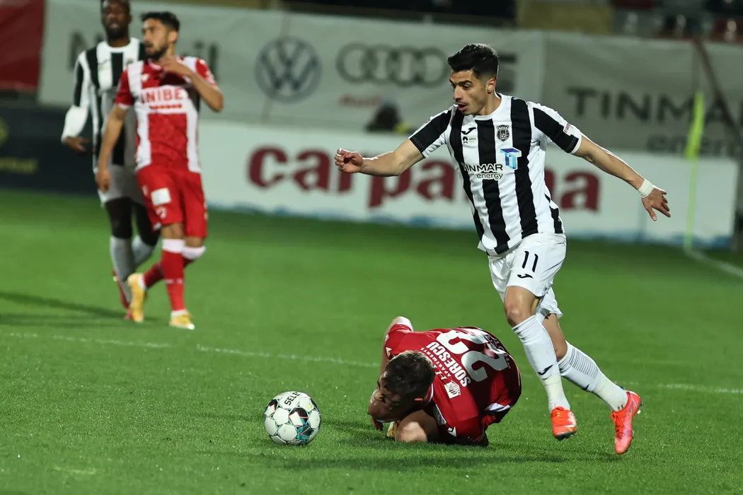 Echipele Astra Giurgiu (echipament alb-negru) si Dinamo Bucuresti s-au intalnit intr-o partida disputata in prima etapa a play-out-ului din Liga 1 la fotbal, vineri, 16 aprilie 2021, la Giurgiu.GEORGE FLUSTER / MEDIAFAX FOTO