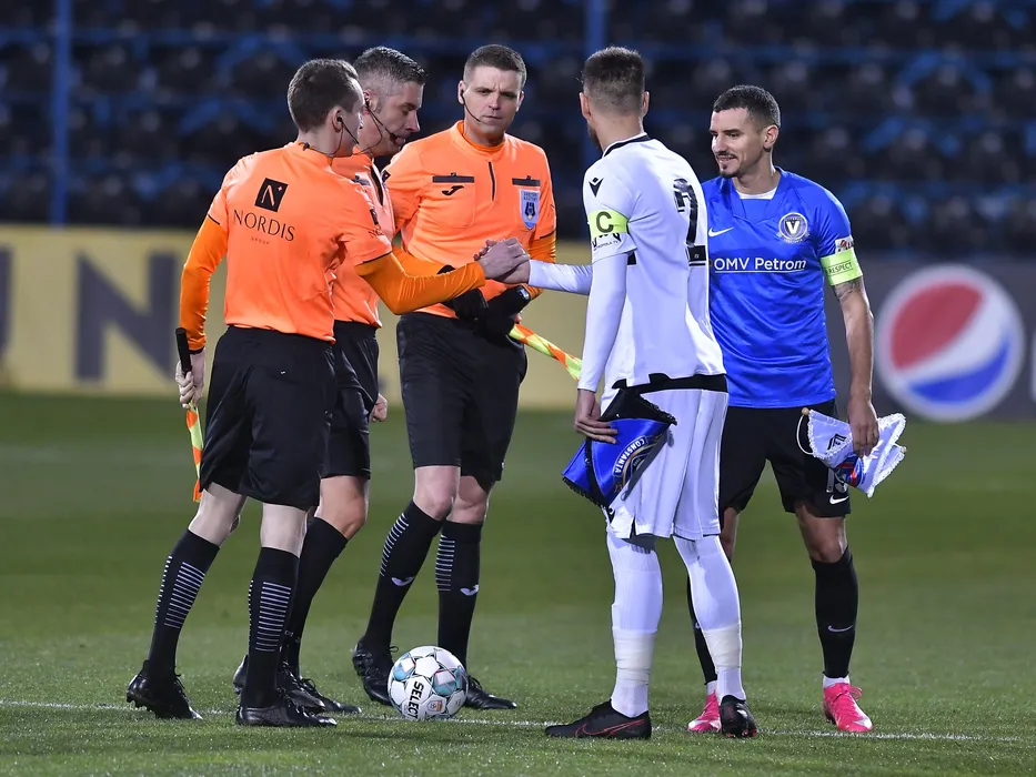 Brigada de arbitrii formata din Mihai Marica, Radu Marian Petrescu si George Florin Neacsu alaturi de capitanii Cosmin Florin Achim si Romario Sandu Benzar in meciul de fotbal dintre FC Viitorul Constanta si FC Voluntari, din cadrul Ligii 1 Casa Pariurilor, desfasurat fara spectatori pe Stadionul Central al Academiei Gheorghe Hagi din Ovidiu, luni 8 februarie 2021. © FOTO:Razvan Pasarica/SPORT PICTURES