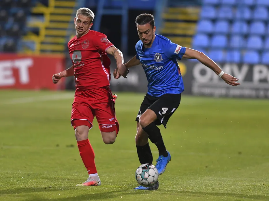 Mihai Ionut Butean si Damien Dylan Dussaut in meciul de fotbal dintre FC Viitorul Constanta si Gaz Metan Medias, din cadrul Ligii 1 Casa Pariurilor, desfasurat fara spectatori pe Stadionul Central al Academiei Gheorghe Hagi din Ovidiu, luni 12 aprilie 2021. © FOTO:Razvan Pasarica/SPORT PICTURES