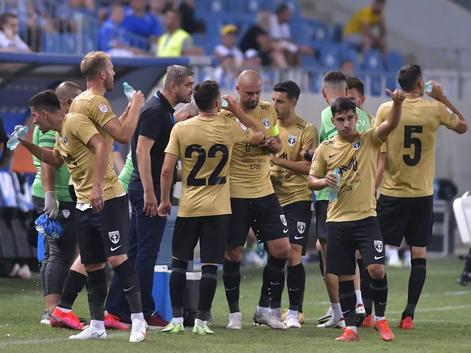 Fotbalistii voluntareni Ricardo Jose Veiga Varzim Miranda, Adam Nemec, Gabriel Sebastian Tamas si Alexandru Mihai Ilie la o pauza de hidratare alaturi de Liviu Ciobotariu in meciul de fotbal dintre Universitatea Craiova si FC Voluntari, contand pentru Liga 1 Casa Pariurilor, desfasurat pe Stadionul Ion Oblemenco din Craiova, luni 9 august 2021. © FOTO:Razvan Pasarica/SPORT PICTURES
