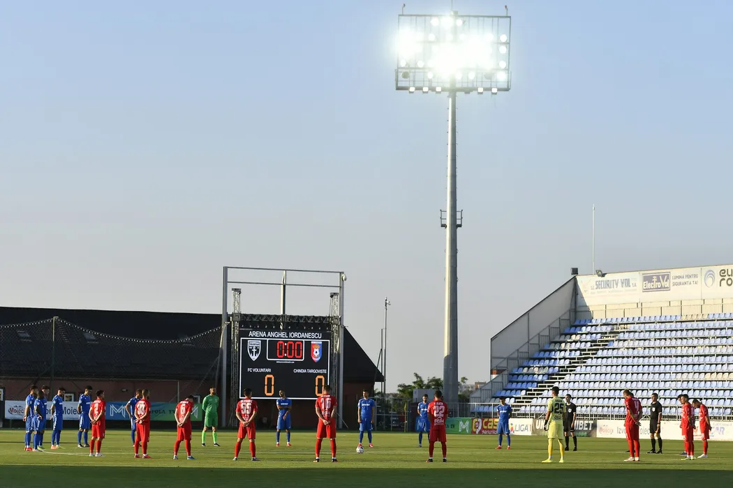 Cele doua echipe tin un minut de reculegere inaintea meciului de fotbal dintre FC Voluntari si Chindia Targoviste, contand pentru play-out-ul Ligii 1 Casa Pariurilor, disputat fara spectatori pe Stadionul Anghel Iordanescu din Voluntari, miercuri 1 iulie 2020.© FOTO:Razvan Pasarica/SPORT PICTURES