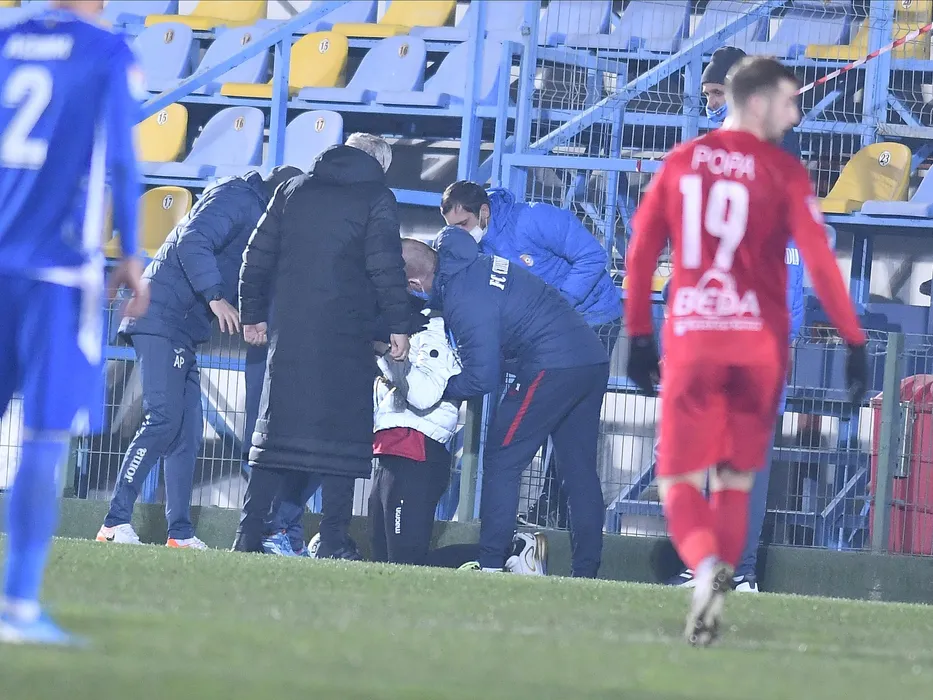 Un copil de mingi primeste ingrijiri medicale in meciul de fotbal dintre FC Voluntari si Chindia Targoviste, contand pentru Liga 1 Casa Pariurilor, desfasurat fara spectatori pe Stadionul Anghel Iordanescu din Voluntari, miercuri 16 decembrie 2020. © FOTO:Razvan Pasarica/SPORT PICTURES