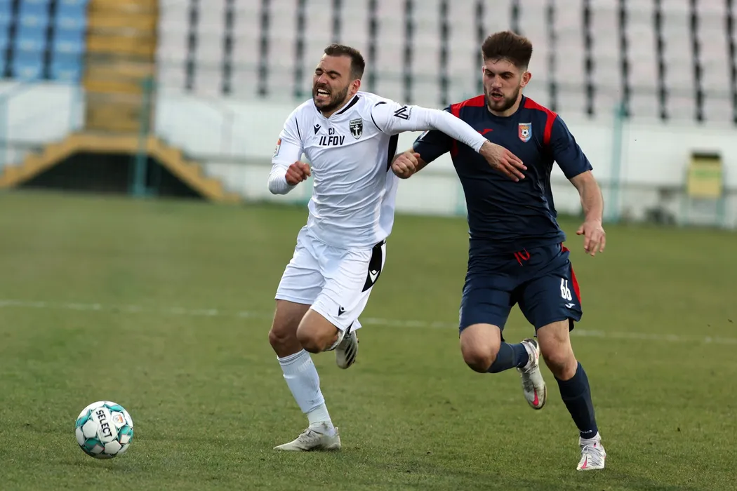 Paul Iacob (D), de la Chindia Targoviste, lupta pentru balon cu Viktor Anghelov (D), de la FC Voluntari in meciul de fotbal din etapa 29 a Ligii 1, disputat pe stadionul Municipal din Buzau, luni, 5 aprilie 2021. GEORGE FILIP / MEDIAFAX FOTO