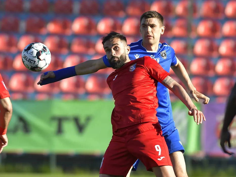 Valmir Berisha si Igor Armas in meciul de fotbal dintre FC Voluntari si Chindia Targoviste, contand pentru Play-off-ul Ligii 1 Casa Pariurilor, desfasurat fara spectatori pe Stadionul Anghel Iordanescu din Voluntari, luni 10 mai 2021. © FOTO:Razvan Pasarica/SPORT PICTURES