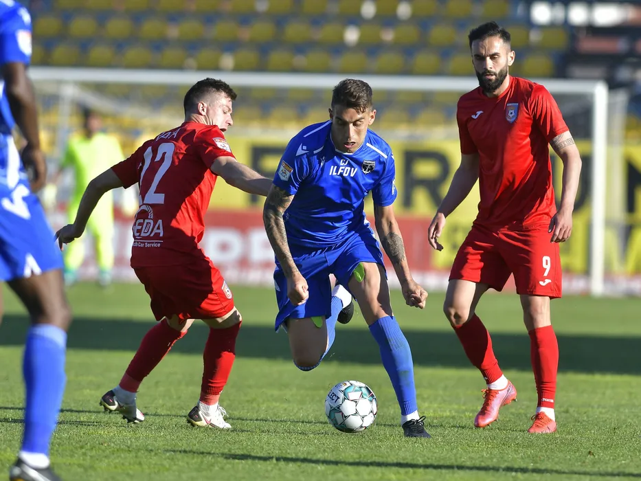 Vadim Rata, Jefte Sanchez Betancor si Valmir Berisha in meciul de fotbal dintre FC Voluntari si Chindia Targoviste, contand pentru Play-off-ul Ligii 1 Casa Pariurilor, desfasurat fara spectatori pe Stadionul Anghel Iordanescu din Voluntari, luni 10 mai 2021. © FOTO:Razvan Pasarica/SPORT PICTURES