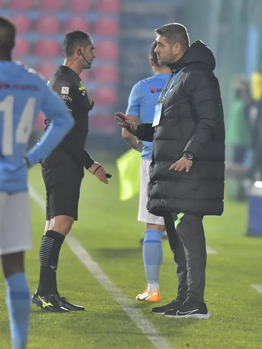 Arbitrul central Iulian Calin discuta cu Liviu Ciobotariu in meciul de fotbal dintre FC Voluntari si Dinamo Bucuresti, contand pentru Liga 1 Casa Pariurilor, desfasurat pe Stadionul Anghel Iordanescu din Voluntari, luni 22 noiembrie 2021. © FOTO:Razvan Pasarica/SPORT PICTURES