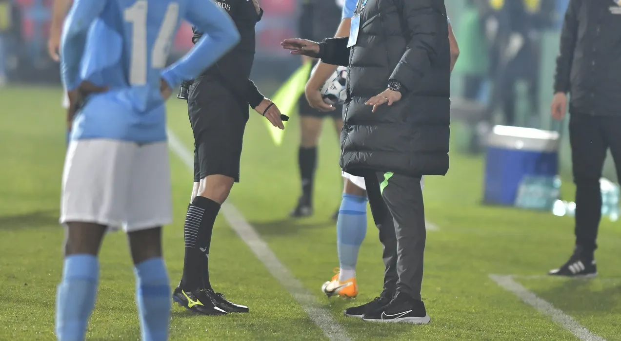Arbitrul central Iulian Calin discuta cu Liviu Ciobotariu in meciul de fotbal dintre FC Voluntari si Dinamo Bucuresti, contand pentru Liga 1 Casa Pariurilor, desfasurat pe Stadionul Anghel Iordanescu din Voluntari, luni 22 noiembrie 2021. © FOTO:Razvan Pasarica/SPORT PICTURES