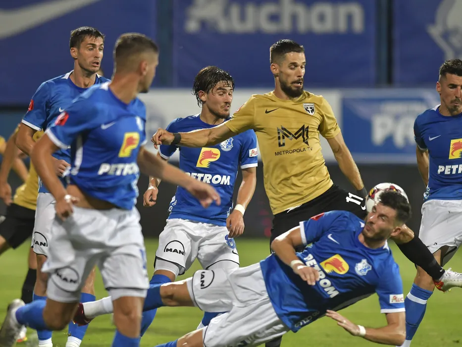 Ionut Justinian Larie, Alexi Paul Pitu si Daniel Constantin Florea in meciul de fotbal dintre Farul Constanta si FC Voluntari, contand pentru Superliga Superbet, desfasurat pe Stadionul central al Academiei Gheorghe Hagi din Ovidiu, luni 22 august 2022. © FOTO:Razvan Pasarica/SPORT PICTURES