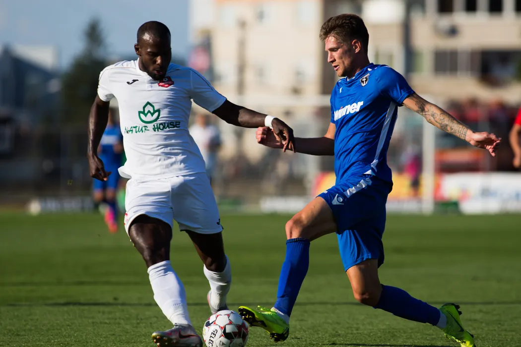 Meciul de fotbal dintre AFC Hermannstadt (echipament alb) si FC Voluntari (echipament albastru), din etapa a IX-a a Ligii 1, disputat pe stadionul Municipal din Sibiu, sambata, 11 iulie 2020. OVIDIU MATIU / MEDIAFAX FOTO