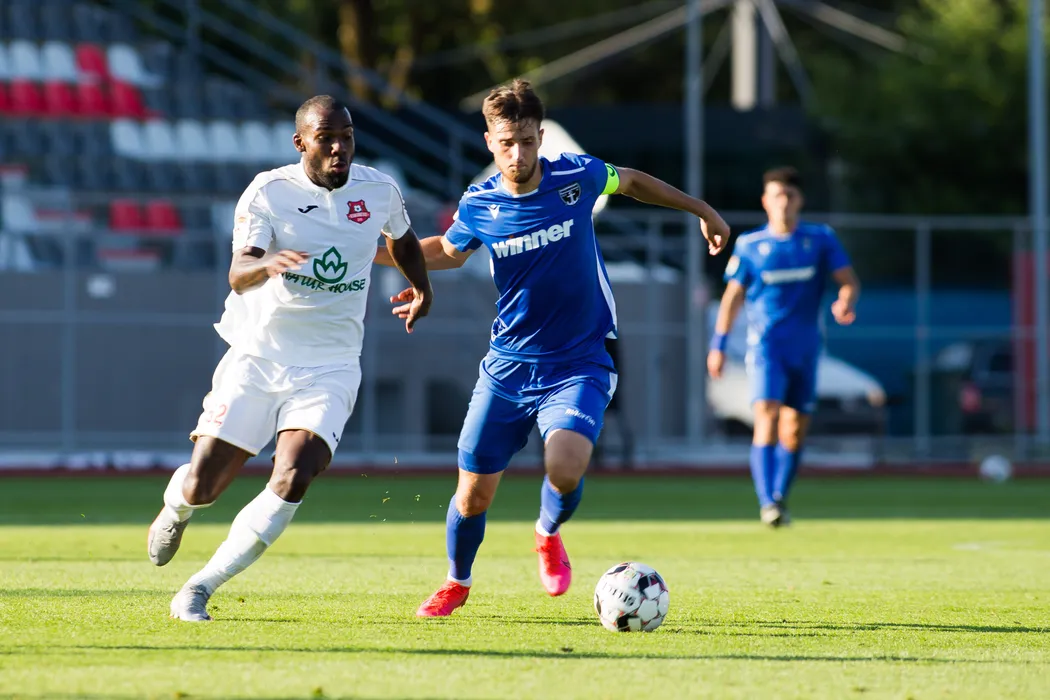 Meciul de fotbal dintre AFC Hermannstadt (echipament alb) si FC Voluntari (echipament albastru), din etapa a IX-a a Ligii 1, disputat pe stadionul Municipal din Sibiu, sambata, 11 iulie 2020. OVIDIU MATIU / MEDIAFAX FOTO