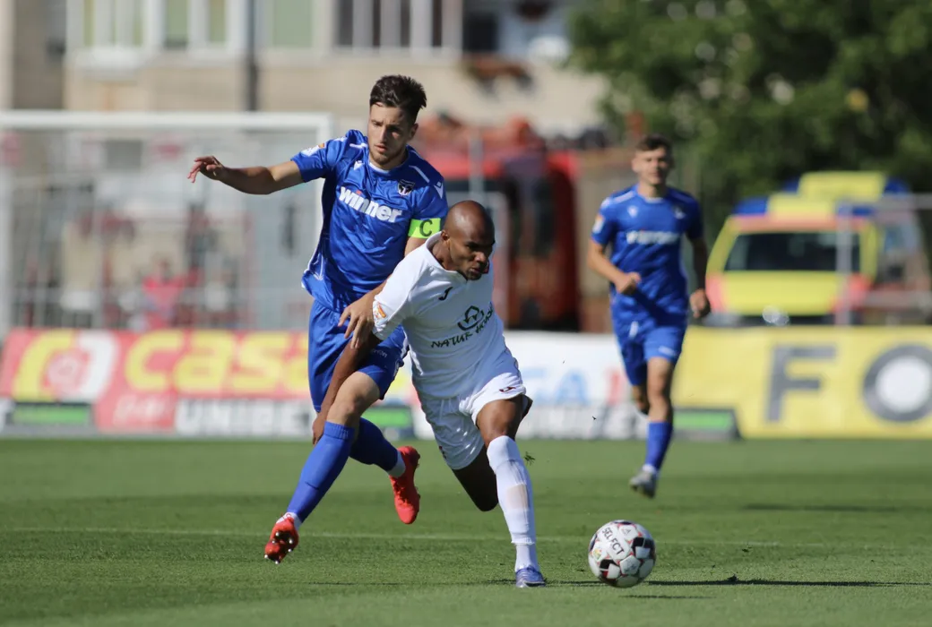Meciul de fotbal dintre AFC Hermannstadt (echipament alb) si FC Voluntari (echipament albastru), din etapa a IX-a a Ligii 1, disputat pe stadionul Municipal din Sibiu, sambata, 11 iulie 2020. OVIDIU MATIU / MEDIAFAX FOTO