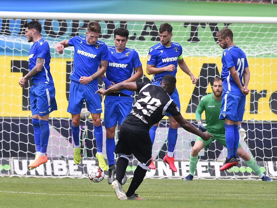 Zid al celor de la Voluntari cu Claudiu Belu Iordache, Marko Simonovski, Alexandru Stefan Pascanu, Mihai Cristian Capatina si Pablo De Lucas Torres in meciul de fotbal dintre FC Voluntari si CSM Politehnica Iasi, contand pentru play-out-ul Ligii 1 Casa Pariurilor, disputat fara spectatori pe Stadionul Anghel Iordanescu din Voluntari, duminica 21 iunie 2020.© FOTO:Razvan Pasarica/SPORT PICTURES