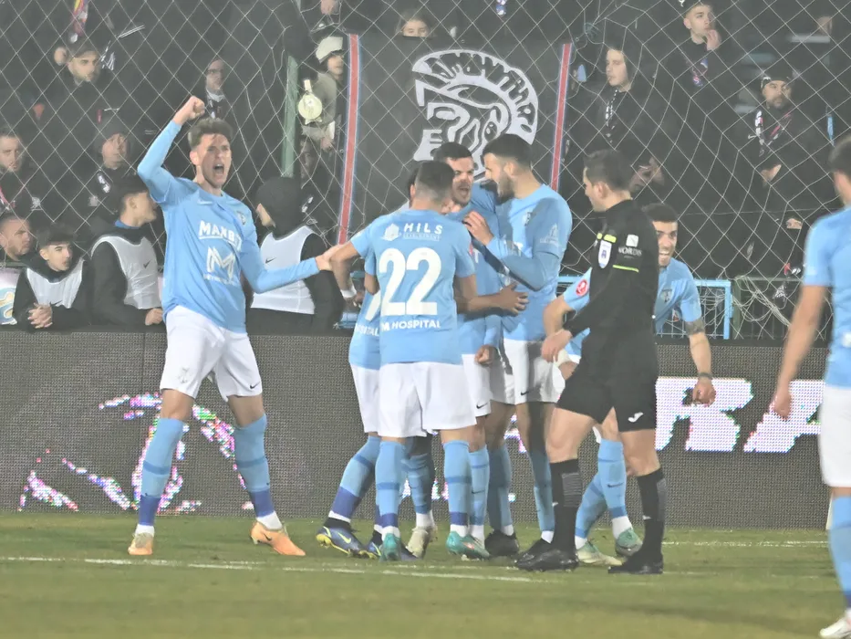 Ioan Andrei Vasile Dumiter se bucură dupa un gol marcat alături de Robert Marian Popescu si Patricio Martin Matricardi în meciul de fotbal dintre FC Voluntari si FCSB, contând pentru Superliga Superbet, desfășurat pe Stadionul Anghel Iordanescu din Voluntari, joi 29 februarie 2024. © FOTO: Răzvan PĂSĂRICĂ/SPORT PICTURES