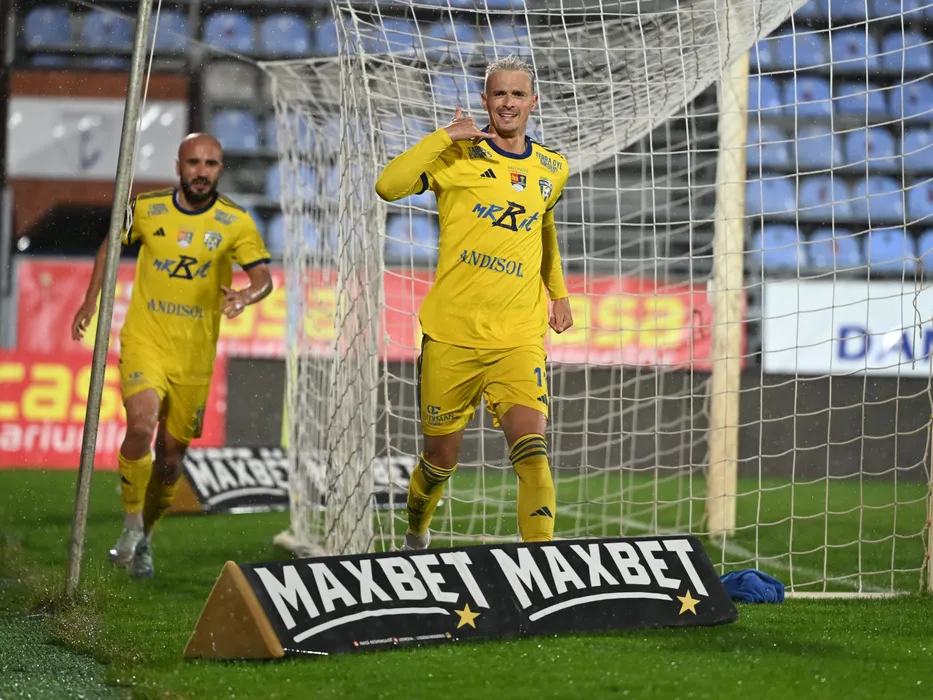 Jakub Vojtus se bucură dupa un gol marcat in meciul de fotbal dintre FC Voluntari si Unirea Slobozia, barajul tur de mentinere/promovare in Superliga Superbet, desfasurat pe Stadionul Anghel Iordanescu din Voluntari, luni 26 mai 2025. © FOTO:Razvan Pasarica/SPORT PICTURES