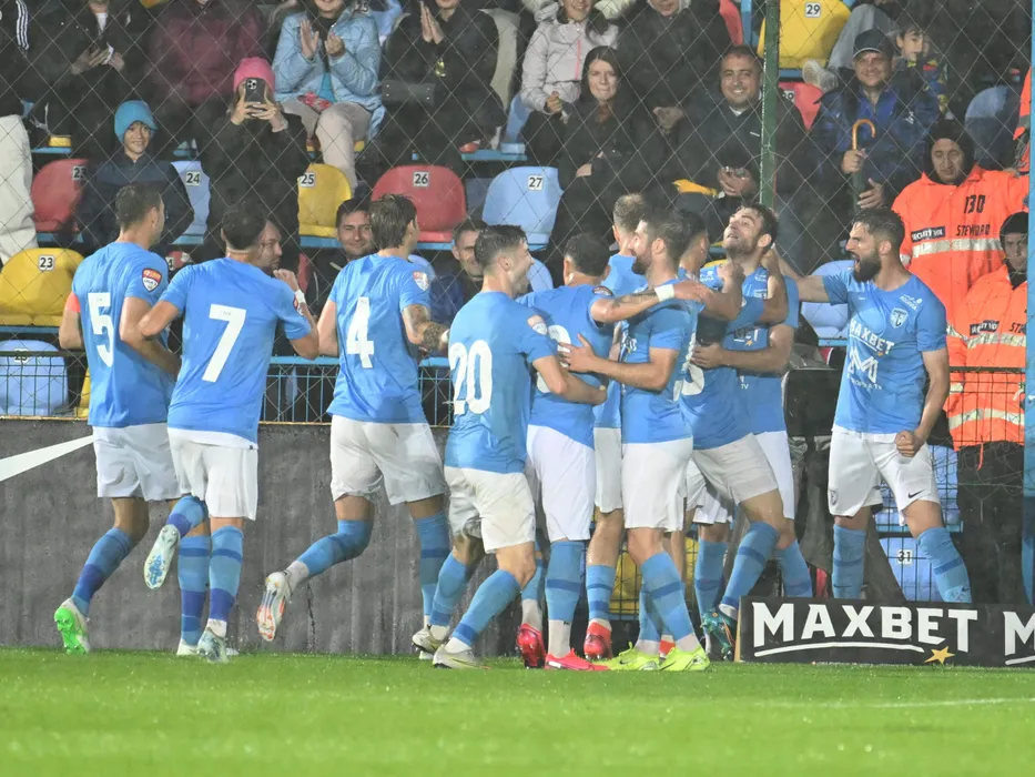 Bucurie a fotbalistilor voluntareni Nicolae Carnat, Daniel Alexandru Git, Doru Popadiuc, Ionut Vladut Andres si Andrei Ovidiu Pitian dupa un gol marcat in meciul de fotbal dintre FC Voluntari si Unirea Slobozia, barajul tur de mentinere/promovare in Superliga Superbet, desfasurat pe Stadionul Anghel Iordanescu din Voluntari, luni 26 mai 2025. © FOTO:Razvan Pasarica/SPORT PICTURES
