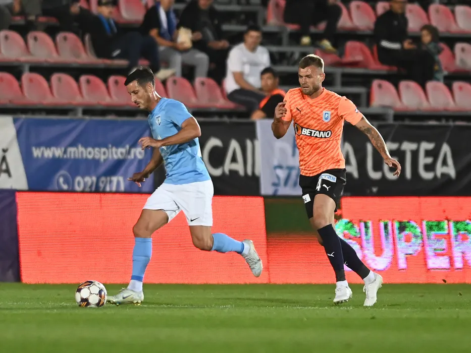 Ricardo Jose Veiga Varzim Miranda si Alexandru Cretu in meciul de fotbal dintre FC Voluntari si Universitatea Craiova, din cadrul Superligii Superbet, desfasurat pe Stadionul Anghel Iordanescu din Voluntari, sambata 7 octombrie 2023. © FOTO:Razvan Pasarica/SPORT PICTURES
