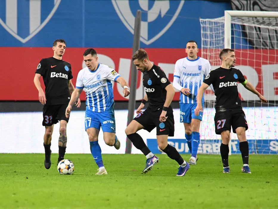 Juri Cisotti, Carlos Andrei Mora Montoya, Mihai Daniel Lixandru, Darius Dumitru Olaru si Oleksandr Romanchuk in meciul de fotbal dintre Universitatea Craiova si FCSB, contand pentru Superliga Superbet, desfasurat pe Stadionul Ion Oblemenco din Craiova, duminica 15 februarie 2026. © FOTO:Razvan Pasarica/SPORT PICTURES