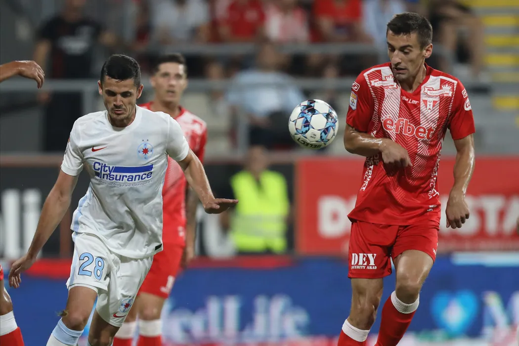 Andrei Dumiter (S), de la FCSB, suteaza in timpul meciului de fotbal contra echipei UTA Arad din etapa a III-a a Ligii 1, disputat pe stadionul Francisc Neuman din Arad, duminica, 1 august 2021. CIPRIAN PETCUT / MEDIAFAX FOTO