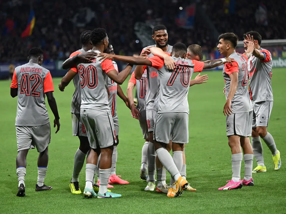 Fotbalistii stelisti Joyskim Aurelien Dawa Tchakonte, Siyabonga Ngezana, Malcolm Edjouma si Iliuta Daniel Popa se bucura dupa un gol marcat in meciul dintre FCSB si Corvinul Hunedoara, Supercupa Romaniei, desfasurat pe Stadionul Steaua-Ghencea din Bucuresti, joi 4 iulie 2024. © FOTO:Razvan Pasarica/SPORT PICTURES