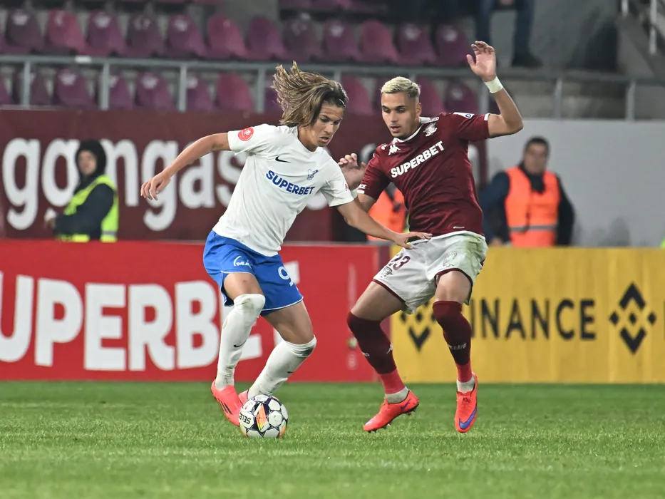 Alexandru Constantin Stoian si Cristian Marian Manea in meciul de fotbal dintre Rapid Bucuresti si Farul Constanta, din cadrul Superligii Superbet, desfasurat pe Superbet Arena-Giulesti din Bucuresti, luni 21 octombrie 2024. © FOTO:Razvan Pasarica/SPORT PICTURES