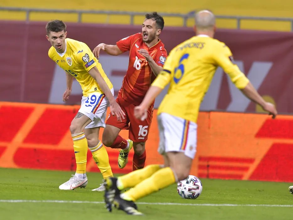 Florin Tanase si Boban Nikolov in meciul de fotbal dintre Romania si Macedonia de Nord, din cadrul Preliminariilor Campionatului Mondial 2022, desfasurat fara spectatori pe Arena Nationala din Bucuresti, joi 25 martie 2021. © FOTO:Razvan Pasarica/SPORT PICTURES