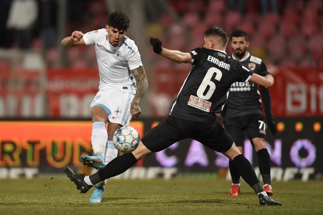 Florinel Coman (S), de la FCSB, suteaza in timpul meciului de fotbal contra echipei Dinamo din etapa a XXIII-a a Ligii 1, disputat pe stadionul Dinamo din Bucuresti, duminica, 30 ianuarie 2022 ALEX NICODIM / MEDIAFAX FOTO
