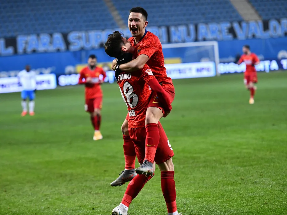 Bucurie a fotbalistilor stelisti dupa un gol marcat cu Dennis Man si Olimpiu Vasile Morutan in meciul de fotbal dintre Universitatea Craiova si FCSB, contand pentru Liga 1 Casa Pariurilor, desfasurat fara spectatori pe Stadionul Ion Oblemenco din Craiova, vineri 18 decembrie 2020. © FOTO:Razvan Pasarica/SPORT PICTURES