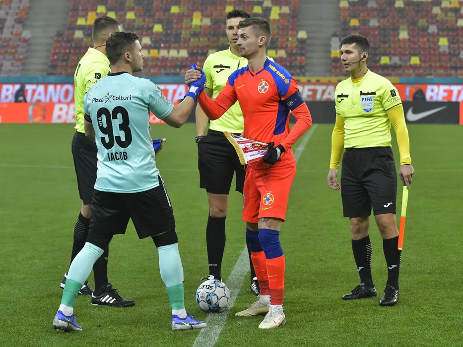 Arbitrii Marian Barbu si Mircea Orbulet alaturi de capitanii Florin Iacob si Florin Lucian Tanase in meciul de fotbal dintre FCSB si UTA Arad, contand pentru Liga 1 Casa Pariurilor, desfasurat pe Arena Nationala din Bucuresti, duminica 5 decembrie 2021. © FOTO:Razvan Pasarica/SPORT PICTURES