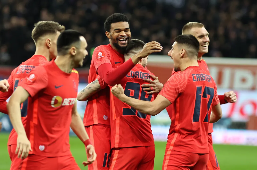 Malcom Edjouma (C), de la FCSB, reactioneaza dupa ce a inscris un gol in timpul meciului de fotbal contra echipei CS Universitatea Craiova din etapa a XXVI-a a Superligii, disputat pe Arena Nationala din Bucuresti, duminica, 19 februarie 2023. GEORGE FILIP/ MEDIAFAX FOTO