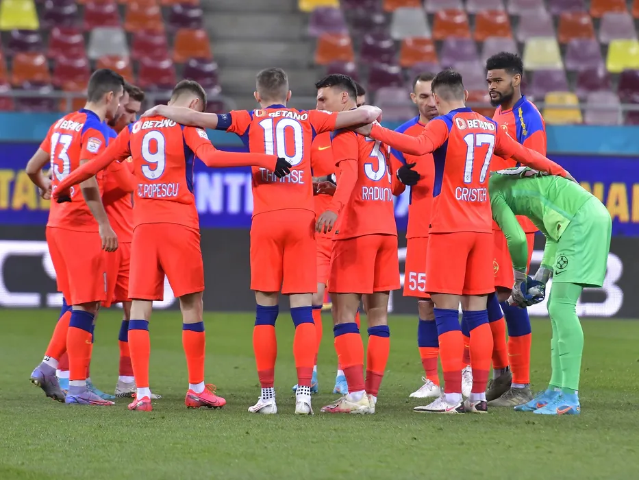 Fotbalistii stelisti printre care Risto Radunovic si Sylas Laouari Edjouma Malcom se incurajeaza la startul meciului de fotbal dintre FCSB si Chindia Targoviste, contand pentru Liga 1 Casa Pariurilor, desfasurat pe Arena Nationala din Bucuresti, duminica 13 februarie 2022. © FOTO:Razvan Pasarica/SPORT PICTURES
