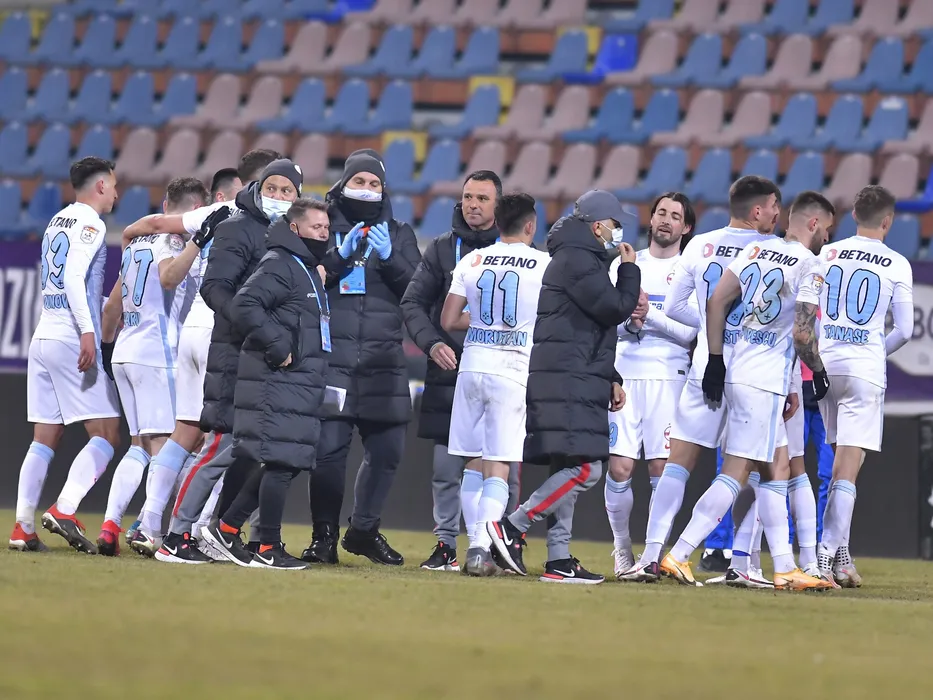 Fotbalistii stelisti alaturi de Toni Petrea bucurosi dupa meciul de fotbal dintre FC Botosani si FCSB, contand pentru Liga 1 Casa Pariurilor, desfasurat fara spectatori pe Stadionul Municipal din Botosani, duminica 28 februarie 2021. © FOTO:Razvan Pasarica/SPORT PICTURES
