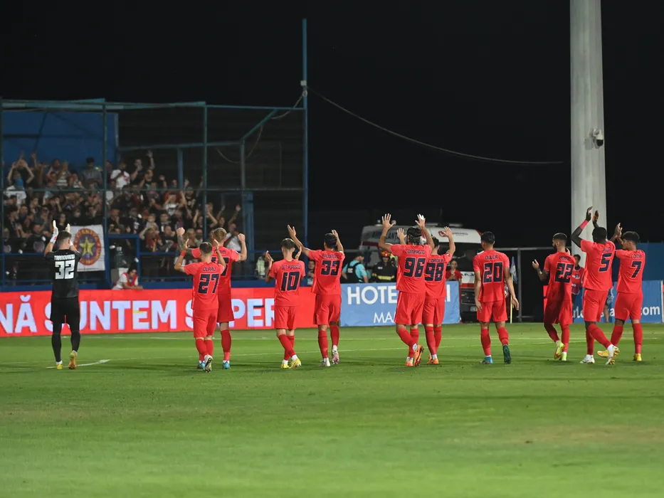 Fotbalistii stelisti saluta galeria in startul meciului de fotbal dintre Farul Constanta si FCSB, contand pentru Superliga Superbet, desfasurat pe Stadionul central al Academiei Gheorghe Hagi din Ovidiu, miercuri 31 august 2022. © FOTO:Razvan Pasarica/SPORT PICTURES