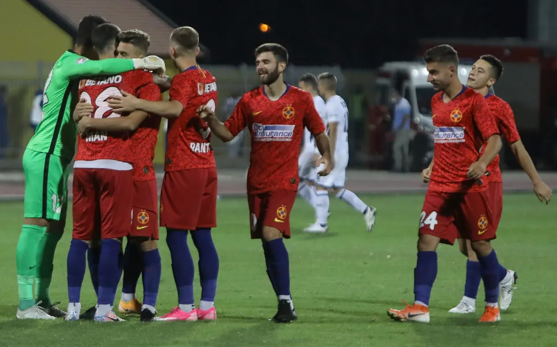 Bucurie stelista cu Ovidiu Horsia, Robert Andrei Ion si Olimpiu Vasile Morutan dupa meciul de fotbal dintre Backa Topola si FCSB, contand pentru Liga Europa, desfasurat fara spectatori pe Stadionul Gradski Senta din Senta, joi 17 septembrie 2020. © FOTO:Ciprian Petcut/SPORT PICTURES