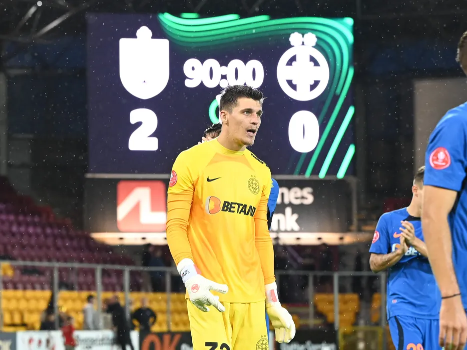 Stefan Tarnovanu alaturi de tabela de marcaj dupa meciul de fotbal dintre FC Nordsjælland si FCSB, din cadrul UEFA Europa Conference League, desfasurat pe Stadionul Right to Dream Park din Farum, joi 17 august 2023. © FOTO:Razvan Pasarica/SPORT PICTURES