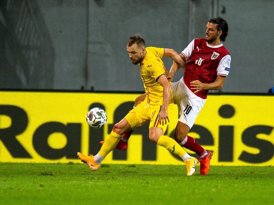 Alexandru Cretu si Florian Grillitsch in meciul de fotbal dintre Austria si Romania, contand pentru Liga Natiunilor, desfasurat fara spectatori pe Stadionul Wörthersee din Klagenfurt, luni 7 septembrie 2020. © FOTO:SPORT PICTURES
