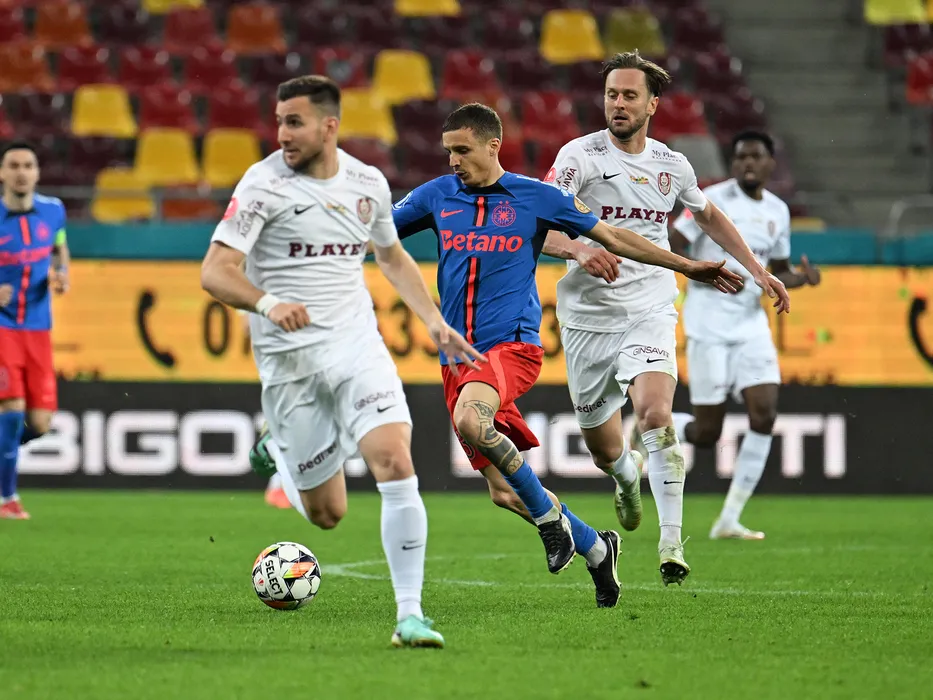 Juri Cisotti si Damjan Djokovic in meciul de fotbal dintre FCSB si CFR Cluj, din cadrul Play off-ului Superligii Superbet, desfasurat pe Arena Nationala din Bucuresti, duminica 20 aprilie 2025. © FOTO:Razvan Pasarica/SPORT PICTURES