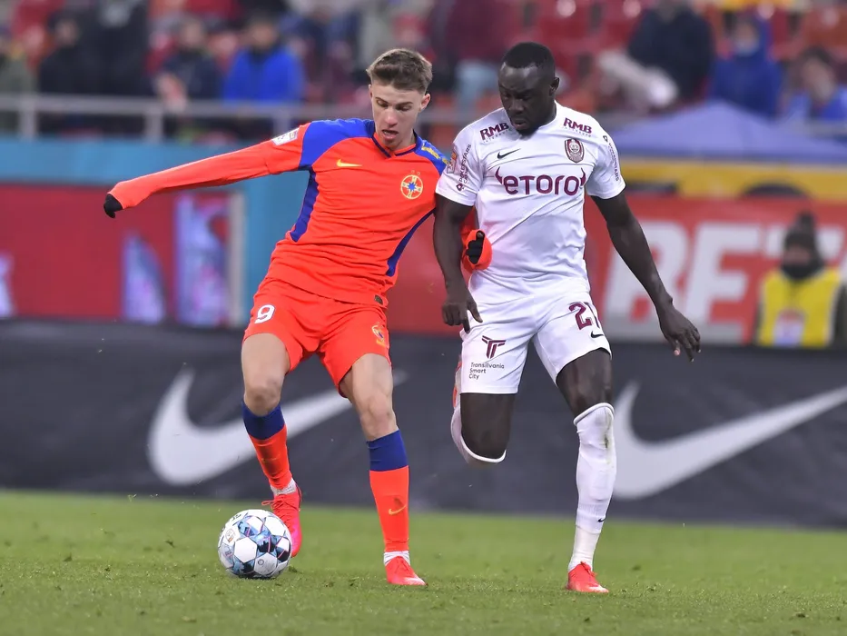 Octavian George Popescu si Bismark Adjei Boateng in meciul de fotbal dintre FCSB si CFR Cluj, contand pentru Liga 1 Casa Pariurilor, desfasurat pe Arena Nationala din Bucuresti, duminica 23 ianuarie 2022. © FOTO:Razvan Pasarica/SPORT PICTURES