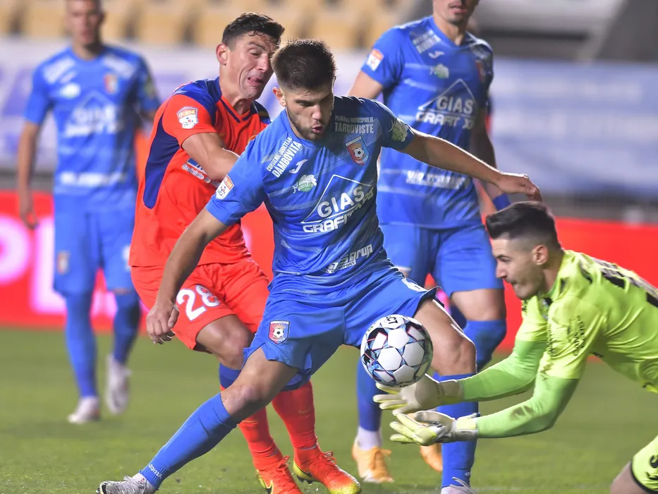 Claudiu Andrei Keseru, Paul Alexandru Iacob si Catalin Vasile Cabuz in meciul de fotbal dintre Chindia Targoviste si FCSB, contand pentru Liga 1 Casa Pariurilor, desfasurat pe Stadionul Ilie Oana din Ploiesti, vineri 1 octombrie 2021. © FOTO:Razvan Pasarica/SPORT PICTURES