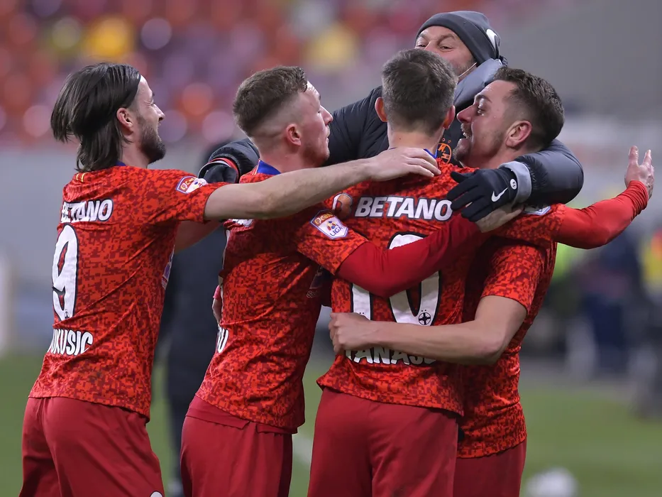Bucurie a fotbalistilor stelisti dupa un gol marcat cu Ante Vukusic, Ionut Constantin Pantiru si Andrei George Miron in meciul de fotbal dintre FCSB si Gaz Metan Medias, contand pentru Liga 1 Casa Pariurilor, desfasurat fara spectatori pe Arena Nationala din Bucuresti, duminica 7 martie 2021. © FOTO:Razvan Pasarica/SPORT PICTURES