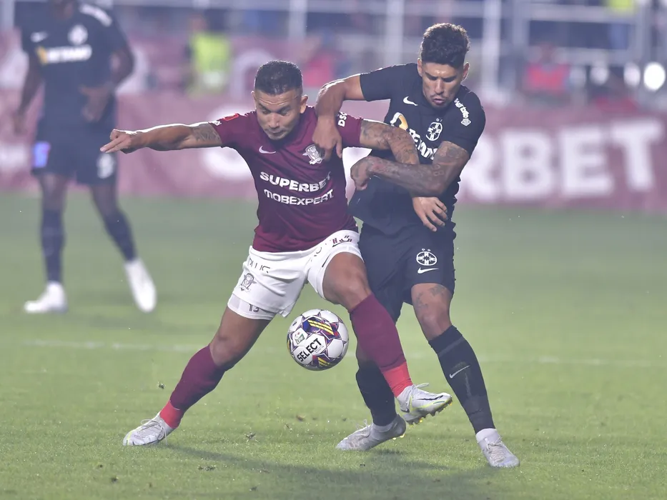 Morais Junior Iraneuton Sousa si Florinel Teodor Coman in meciul de fotbal dintre Rapid Bucuresti si FCSB, contand pentru Superliga Superbet, desfasurat pe Stadionul Rapid Giulesti din Bucuresti, duminica 24 iulie 2022. © FOTO:Razvan Pasarica/SPORT PICTURES